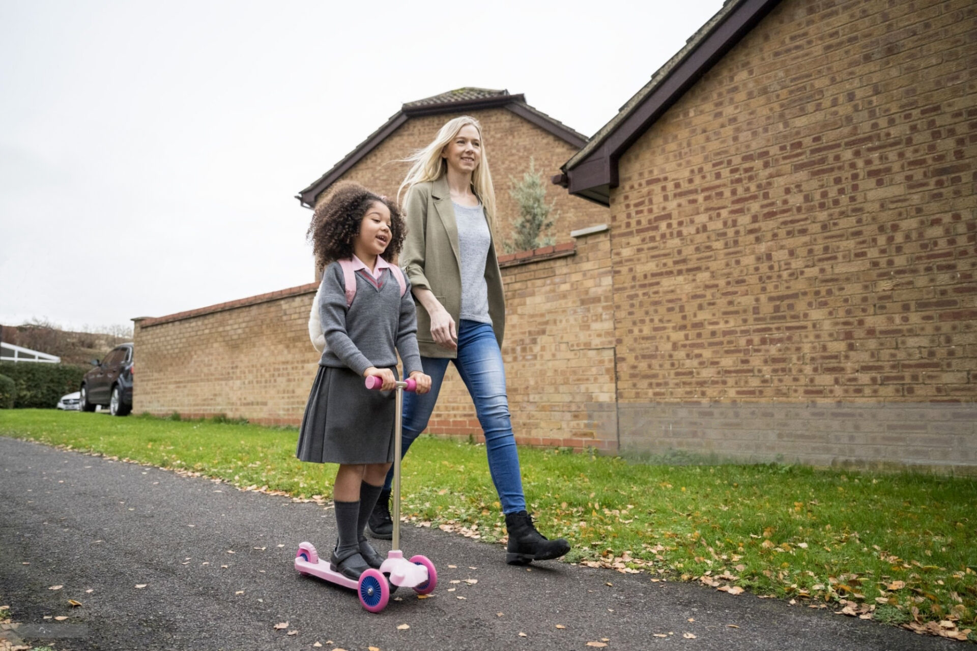 Hyrwyddo’r gwahanol fathau o deithio llesol, gan gynnwys cerdded, ar olwynion, beicio neu sgwtera sy’n gweithio orau i’r teulu.